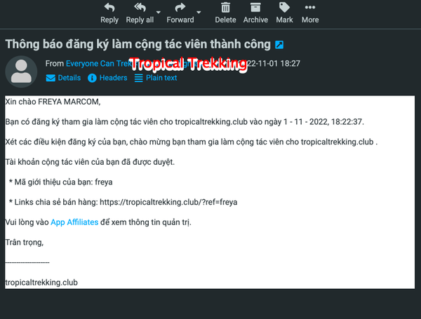 Bước 3: Kiểm tra xem bạn được nhận được email "Thông báo đăng ký làm Cộng tác viên thành công" từ Tropical Trekking như bên dưới chưa. Hãy kiểm tra kĩ cả trong "Spam" nha!